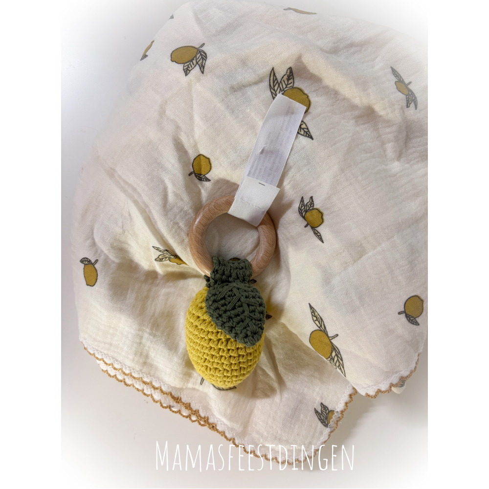 set van een wikkeldoek met citroentjes en een gehaakte rammelaar met houden ring in de vorm van een citroen