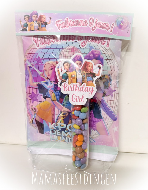 Zakje lays chips van lays en gersonaliserde wikkel met een plastic koken gevuld met smarties en topper in thema . Ingepakt in een feestelijke verpakking