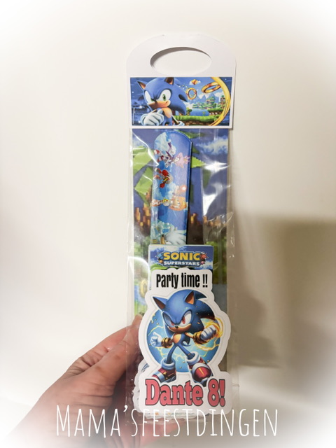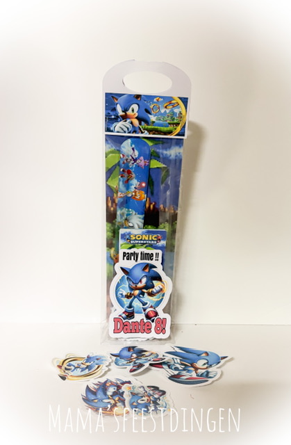 in de party bag van ongveeer 25 cm hoog zitten stickers , een klap armband in thema