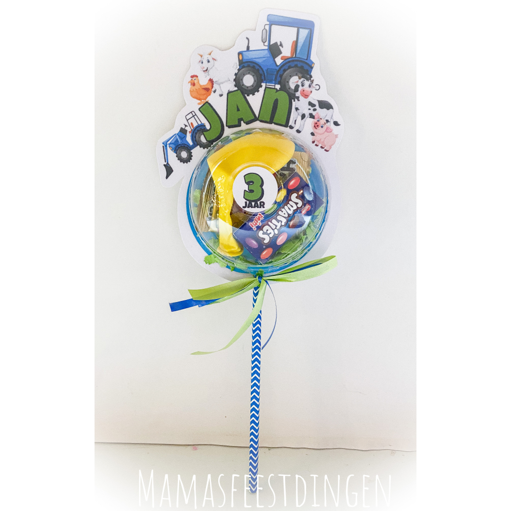 De traktatie bollen zijn ongeveer 25 cm hoog en worden gepersonaliseerd met de naam en leeftijd van de jarige.