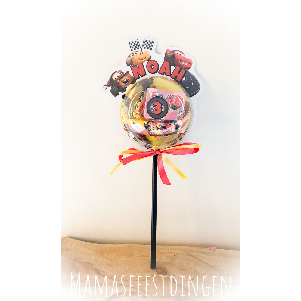 traktatie bol van ongeveer 25 cm hoog gepersonaliseerd met naam en leeftijd van de jarige.