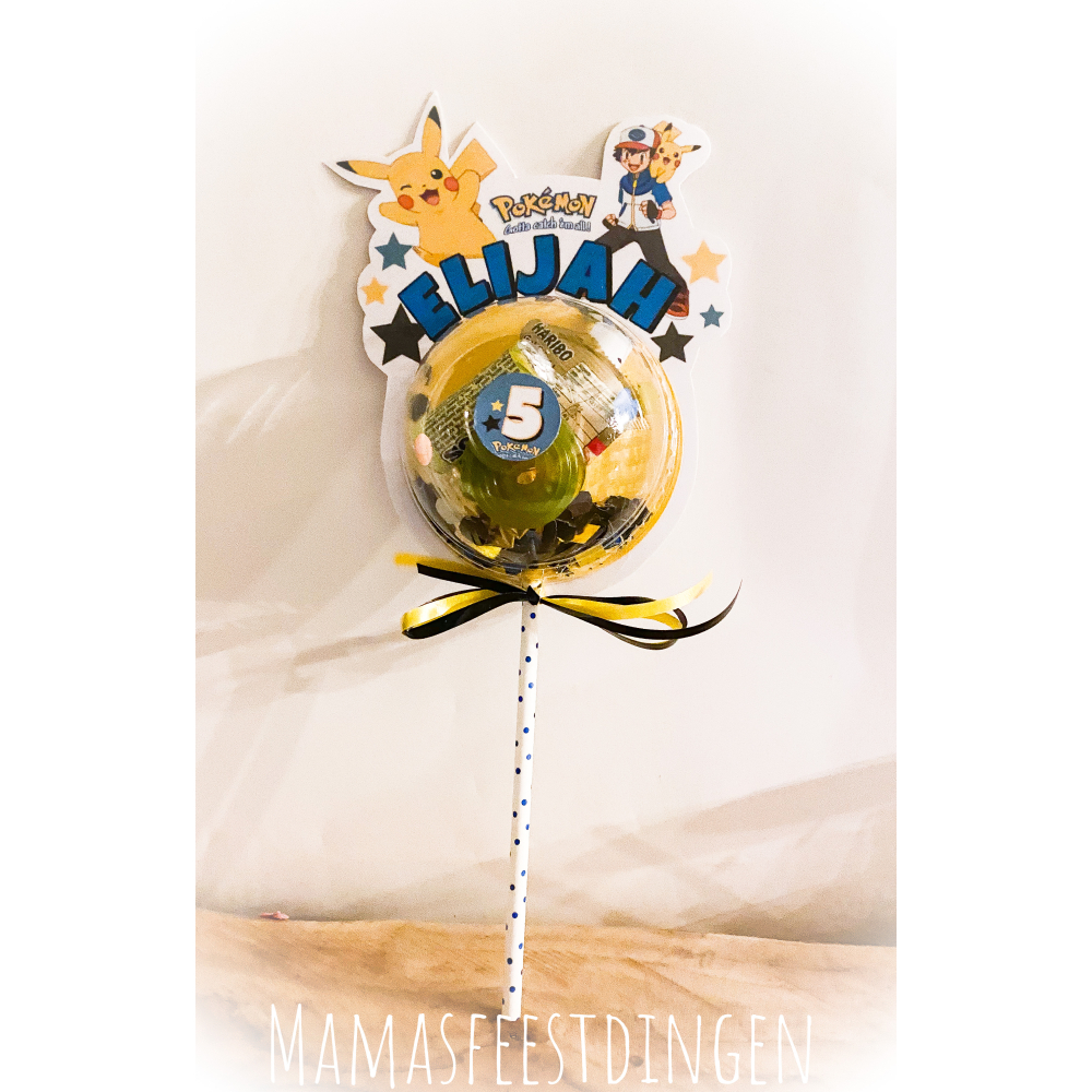 traktatie bol van ongeveer 25 cm hoog gepersonaliseerd met naam en leeftijd van de jarige.