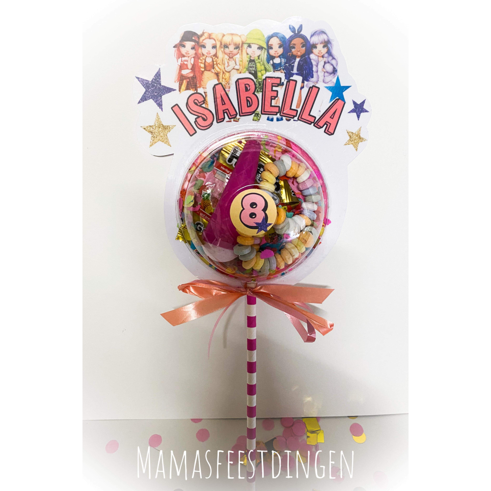traktatie bol van ongeveer 25 cm hoog gepersonaliseerd met naam en leeftijd van de jarige.